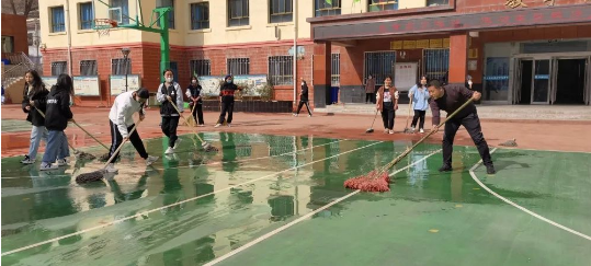 同学们对教室、走廊、楼梯,进行了彻底的打扫,从教学楼到宿舍,从实验室到操场,对学校内外的杂草、垃圾都进行了集中清理,对门窗、镜子、墙面的浮灰进行仔细地擦拭,对操场的污渍进行全面清洗 ,校园里到处涌动着同学们忙碌的身影。