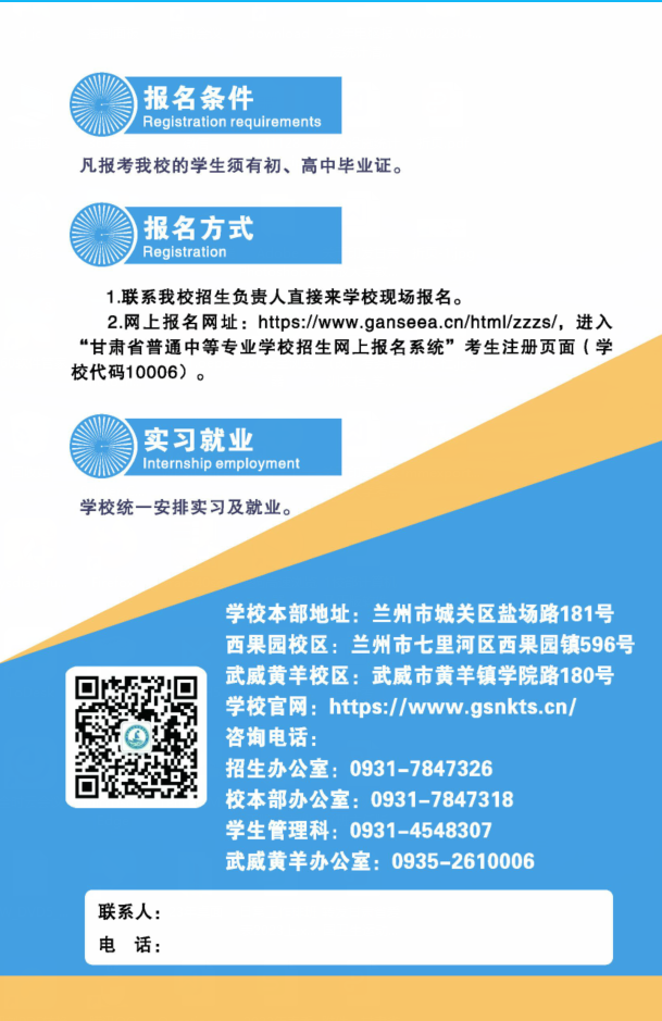 地址:兰州市城关区盐场路校本部、兰州市七里河区西果园校区、武威市黄羊镇校区 邮编:730046 电话:0931-7847318