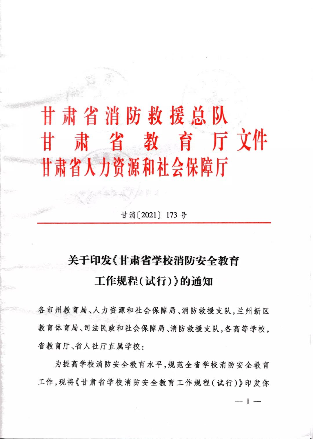 为提高学校消防安全教育水平,规范全省学校消防安全教育工作,近日,甘肃省消防救援总队联合甘肃省教育厅、甘肃省人力资源和社会保障厅出台《甘肃省学校消防安全教育工作规程》,进一步明确全省各级教育、人社、消防救援部门的消防安全教育职责和幼儿园、中小学( 含中等职业学校、技工学校) 、高等院校及相关教育培训机构的消防安全教育工作内容。