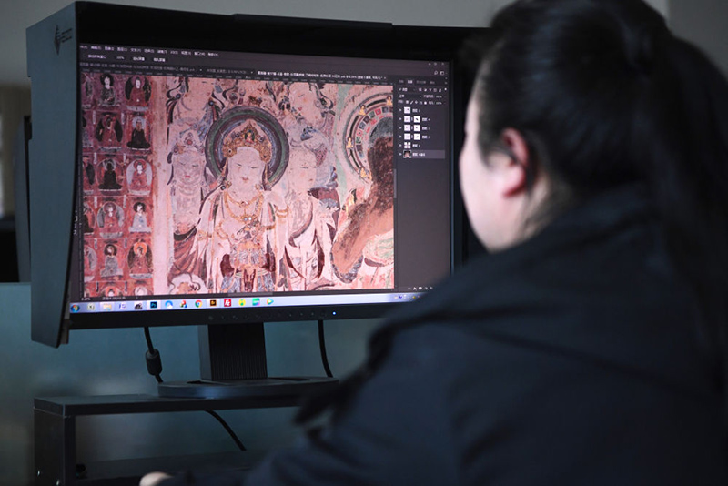 敦煌研究院文物数字化保护团队图像处理人员年海丽在拼接壁画图像(2023年4月25日摄)。数字化探索为莫高窟的保护与传承开辟了全新路径,数字技术让敦煌文物走出洞窟,跨出国门,走向“永久保存、永续利用”。(新华社记者 陈斌/摄)